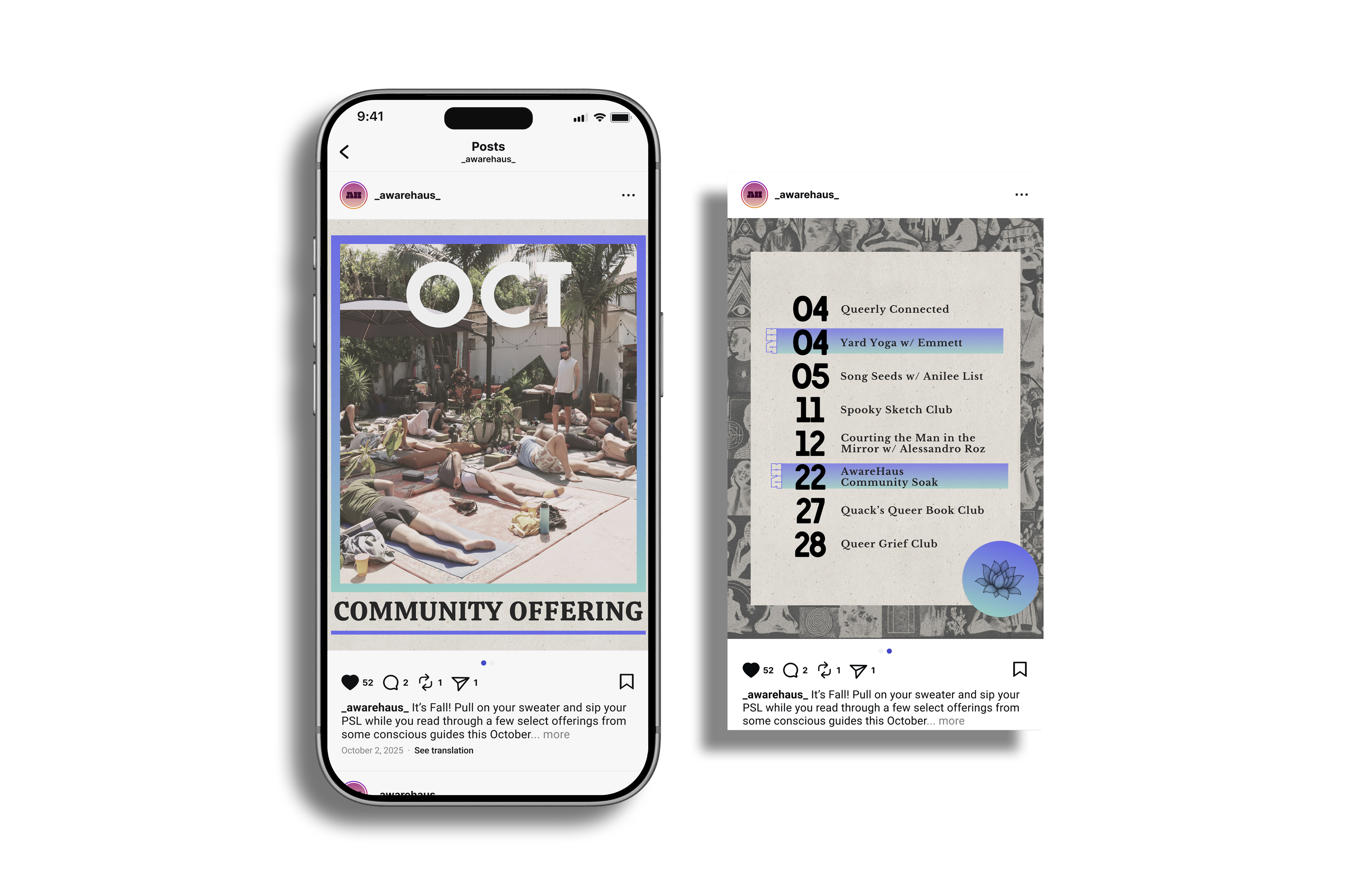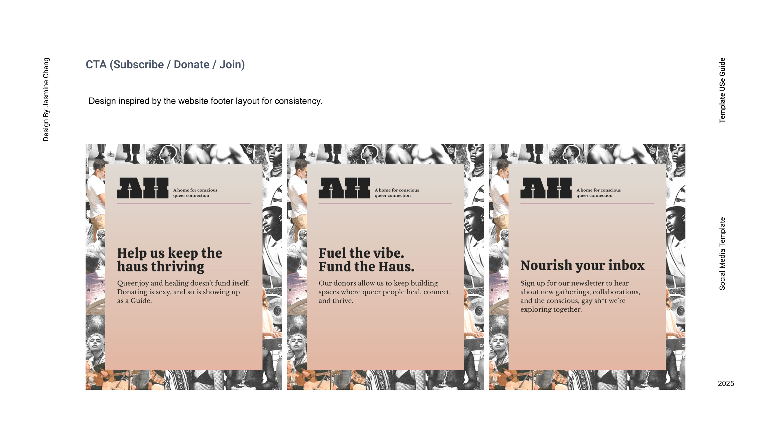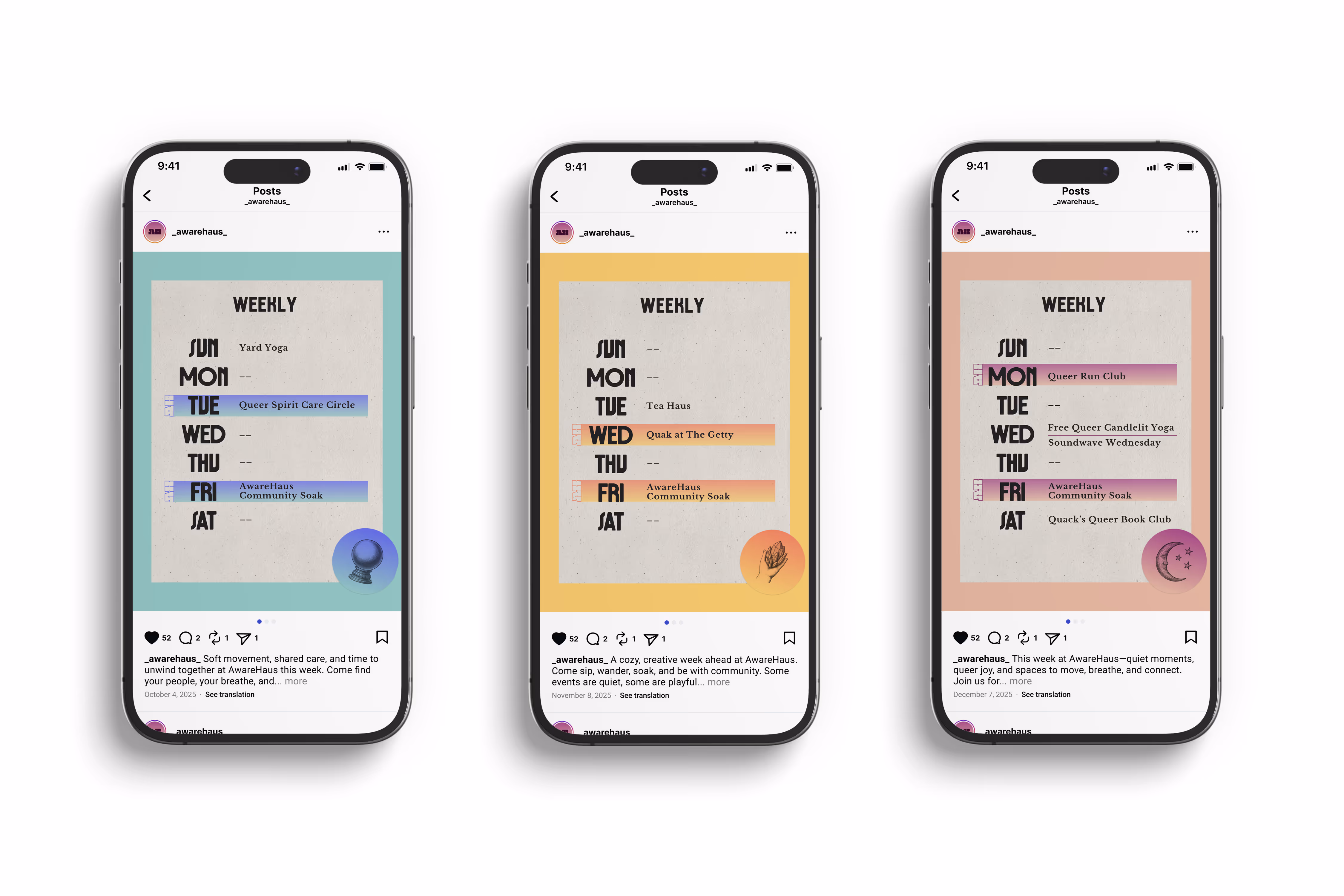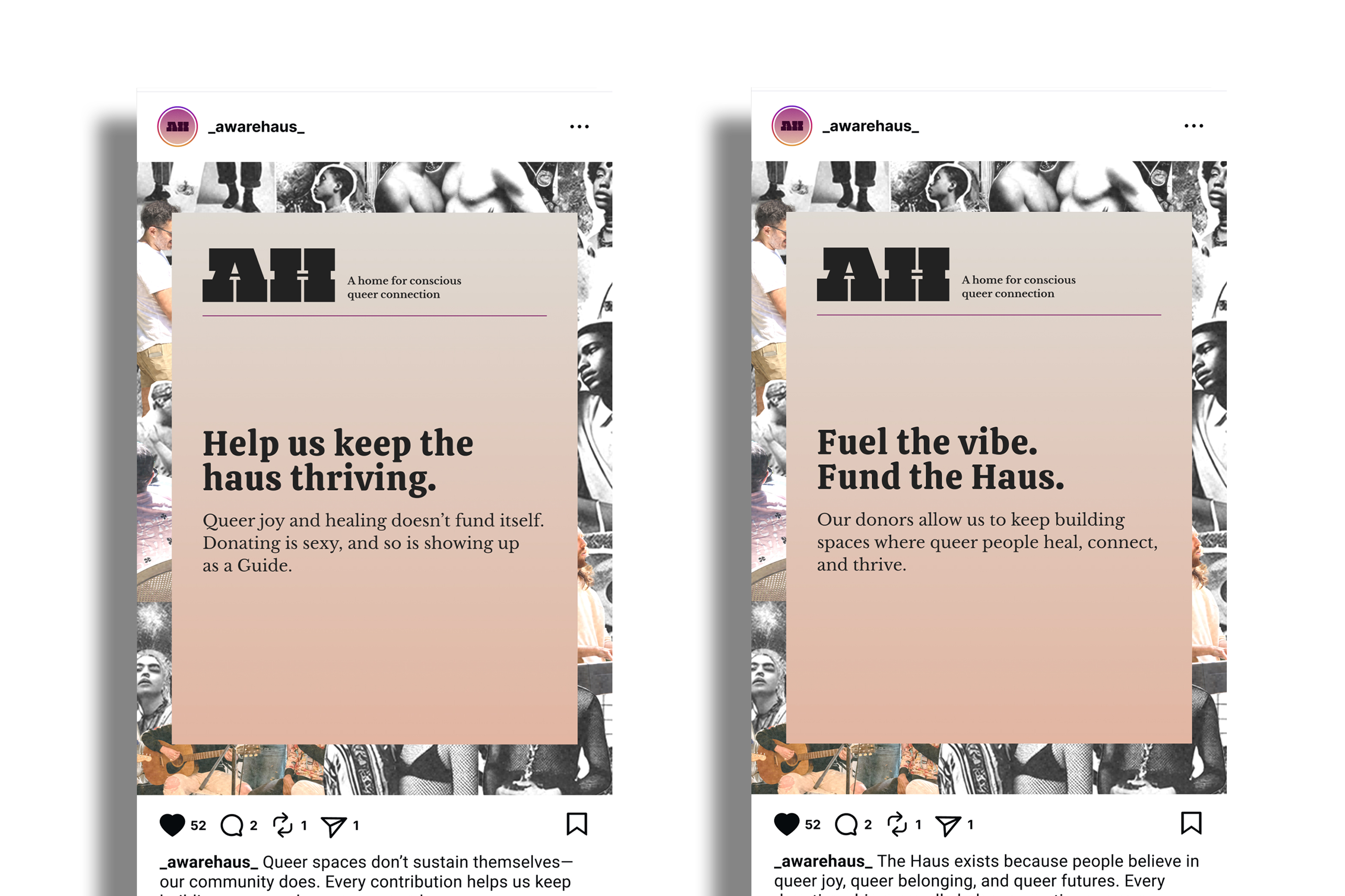 Inspired by the legacy of 1970s gay magazines, AwareHaus’s visual language draws from cheeky classified-style layouts, nostalgic print textures, and collage-based compositions that evoke analog queer connection. I developed a modular social media toolkit designed for flexibility and ease of use, including templates for monthly offerings, weekly schedules, featured events, informational posts, and story-based spotlights. By structuring a rotating color rhythm, refining typographic hierarchy, and integrating reusable graphic elements, the system extends the brand identity into everyday application—making social content both practical to produce and deeply aligned with AwareHaus’s retro-human, community-centered spirit.