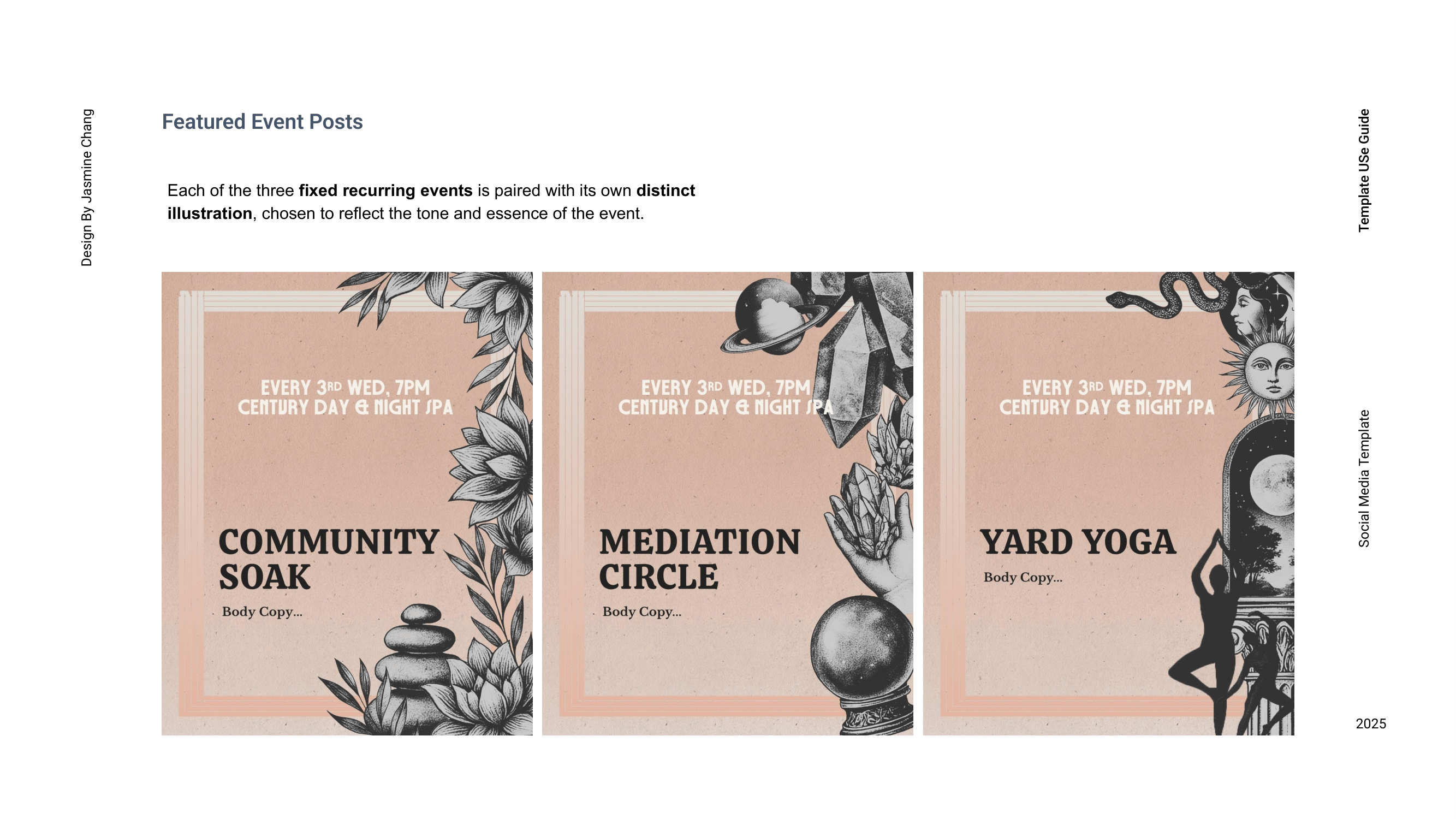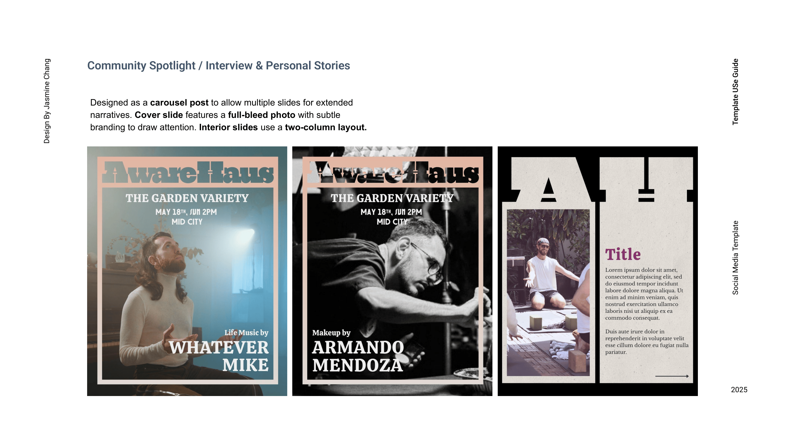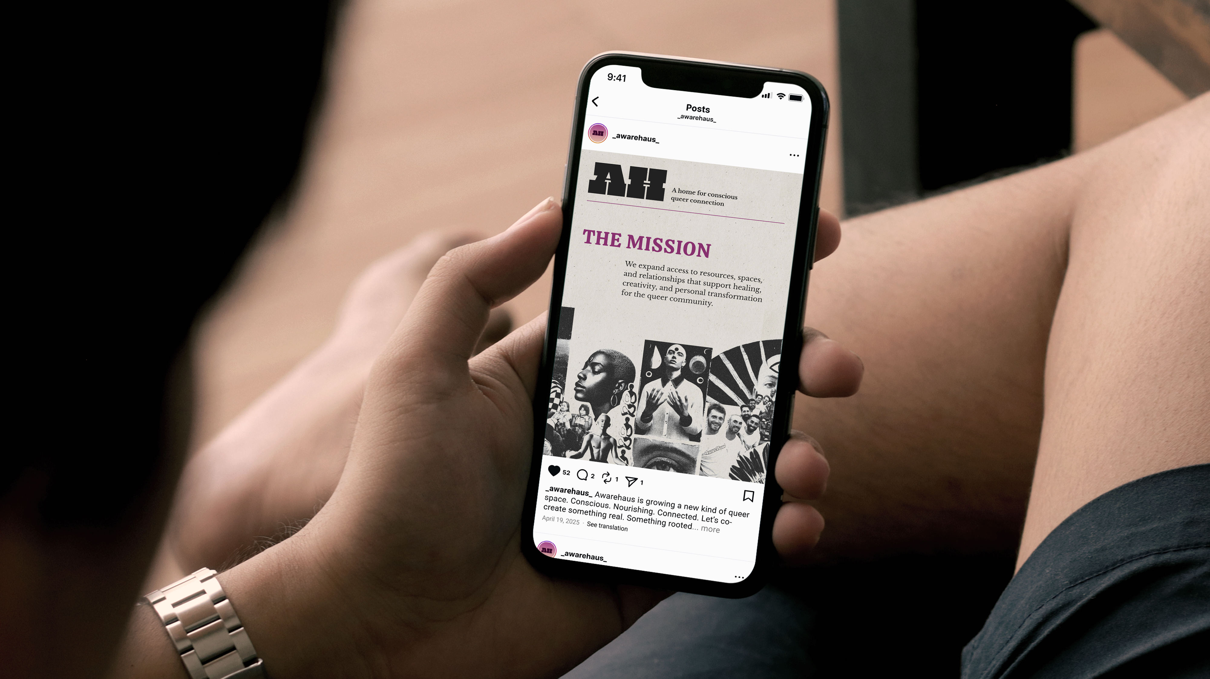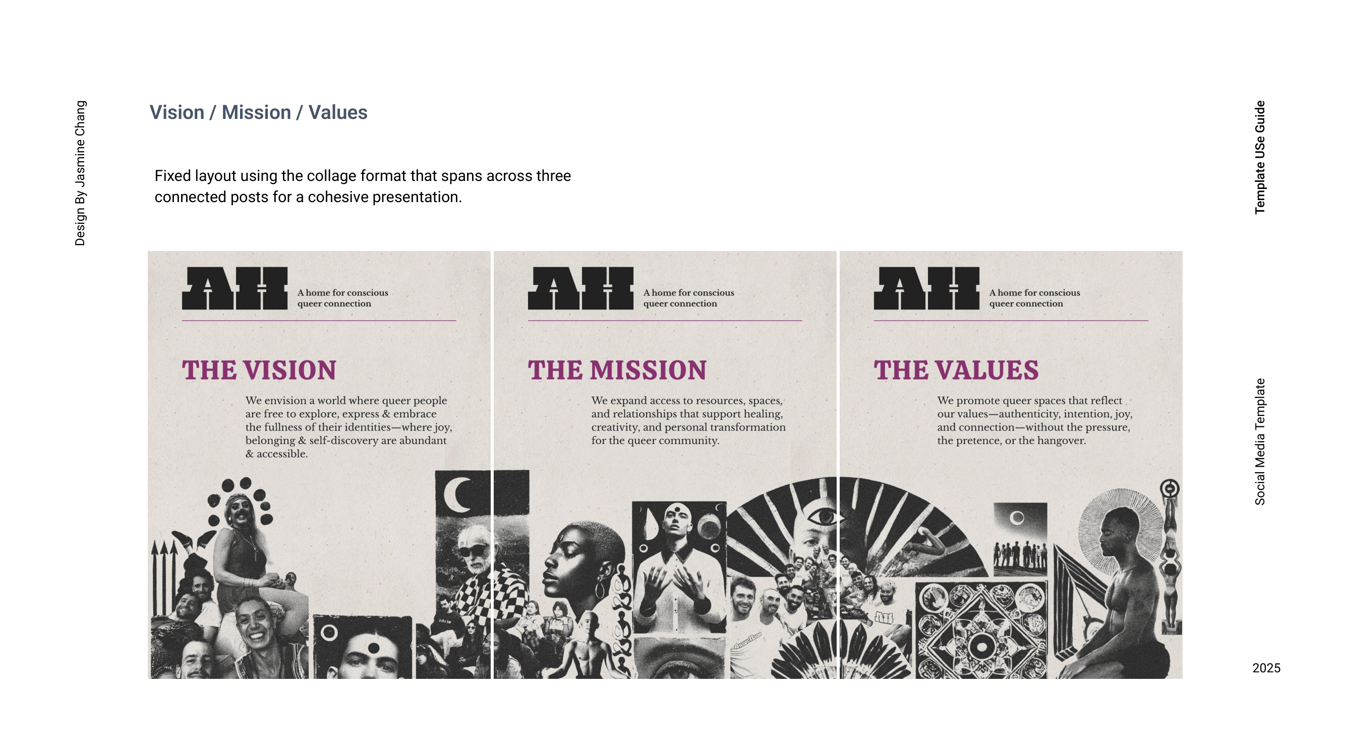 Inspired by the legacy of 1970s gay magazines, AwareHaus’s visual language draws from cheeky classified-style layouts, nostalgic print textures, and collage-based compositions that evoke analog queer connection. I developed a modular social media toolkit designed for flexibility and ease of use, including templates for monthly offerings, weekly schedules, featured events, informational posts, and story-based spotlights. By structuring a rotating color rhythm, refining typographic hierarchy, and integrating reusable graphic elements, the system extends the brand identity into everyday application—making social content both practical to produce and deeply aligned with AwareHaus’s retro-human, community-centered spirit.