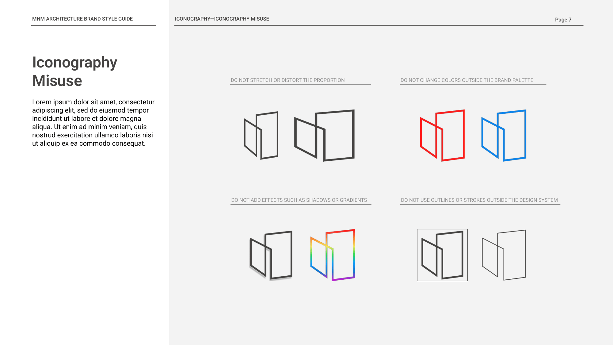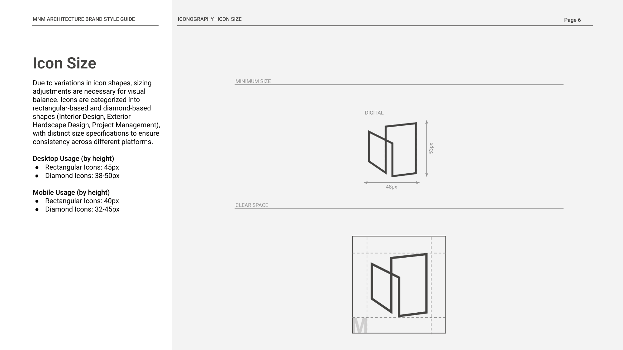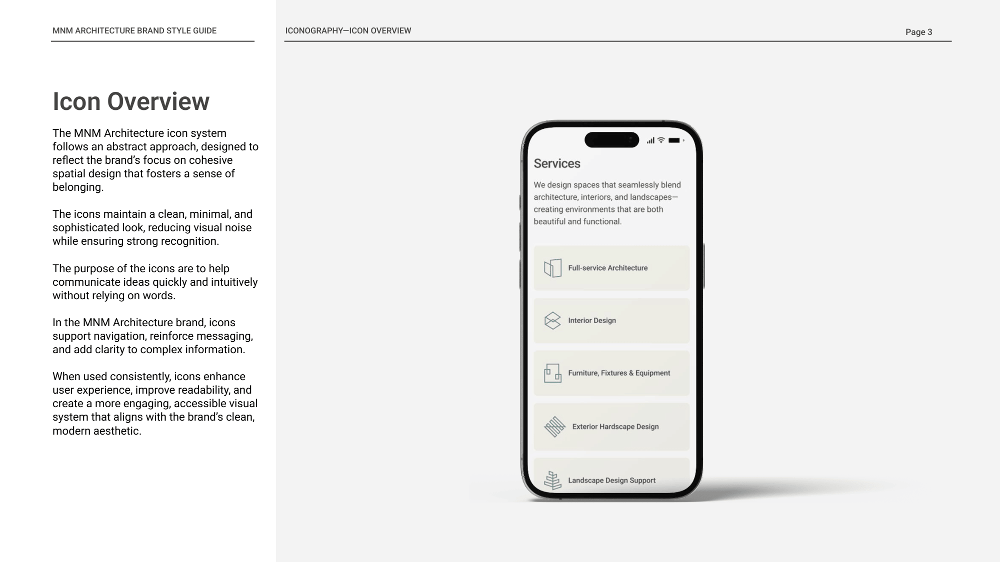 The icon system was developed through an abstract and architectural lens, using clean geometry, continuous line weight, and simplified forms that echo MNM’s design philosophy. Each icon distills a service into a minimal structural symbol—suggesting spatial depth, layering, and built environments without becoming overly literal. Guidelines for sizing, stroke weight, and responsive application ensured cohesion across layouts, allowing the icons to function as both navigational tools and extensions of the studio’s visual identity.