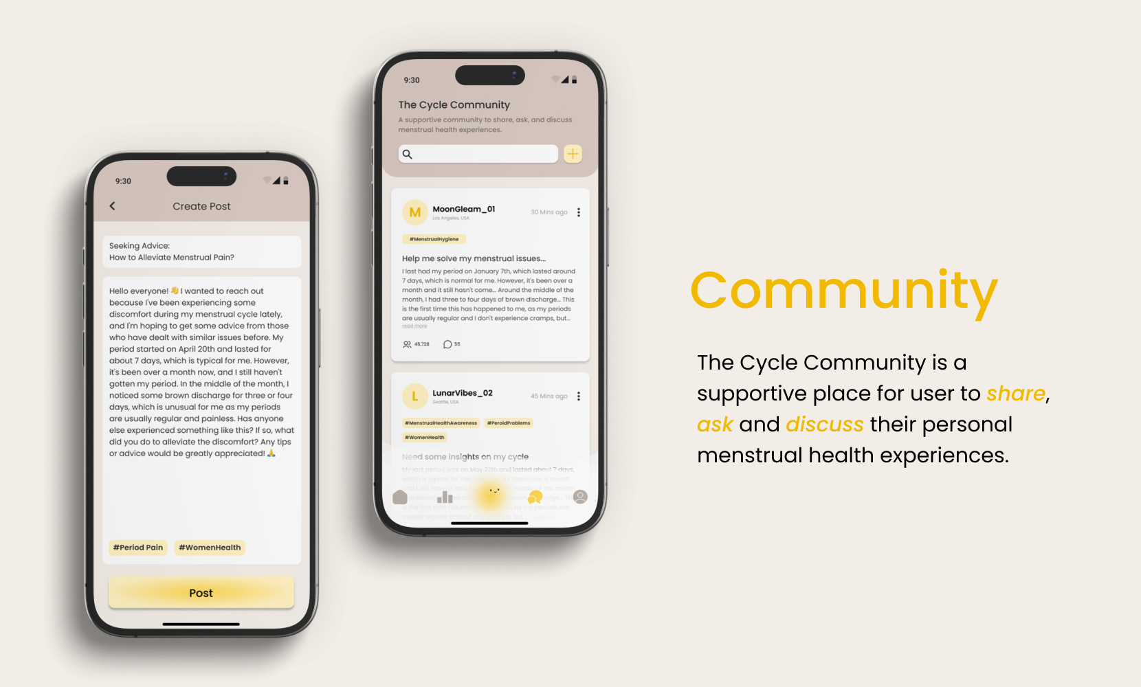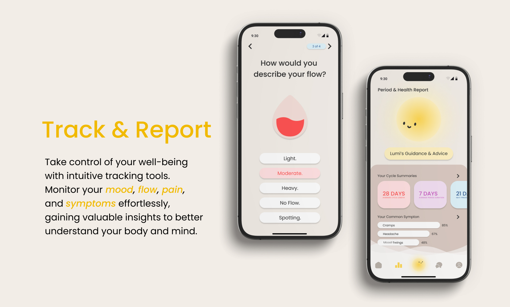 A calm, soothing color palette fosters relaxation and emotional connection. Rounded typography and intuitive navigation support accessibility, while interactive data visualization simplifies cycle tracking. A friendly avatar acts as a personal assistant, offering gentle reminders and guidance to enhance the user experience. Combined with micro-interactions, the design provides a smooth, supportive journey for managing daily wellness.
